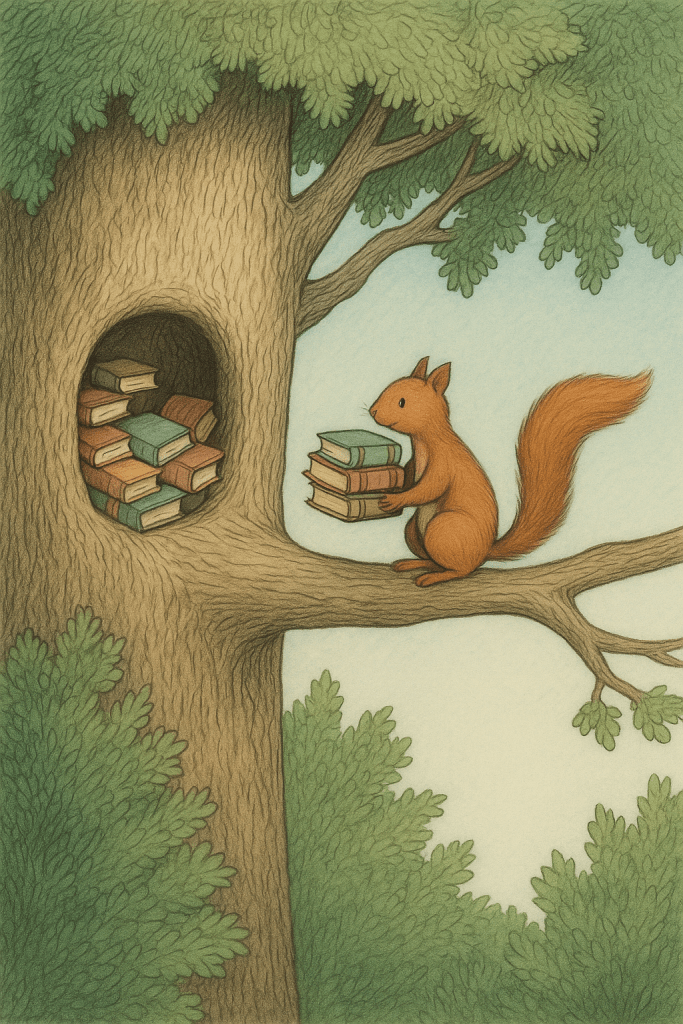 His hollow in the old oak tree was already overflowing. The books were stacked in careful piles: Tales of Daring Feats, Herbal Wisdom of the Woodland, The Song of the Stars, and A Beginner’s Guide to Friendship. Each one a treasure he’d found left behind by humans who picnicked, wandered, and forgot.