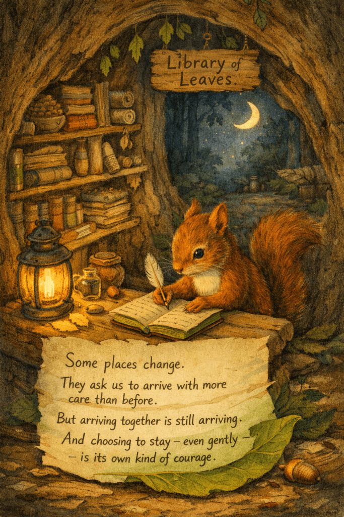 That evening, Pip carried all of it back to his oak hallow where he lit a small lantern and opened his leaf journal. He didn’t write straight away. He listened first — to the creak of branches, to the night settling into itself.